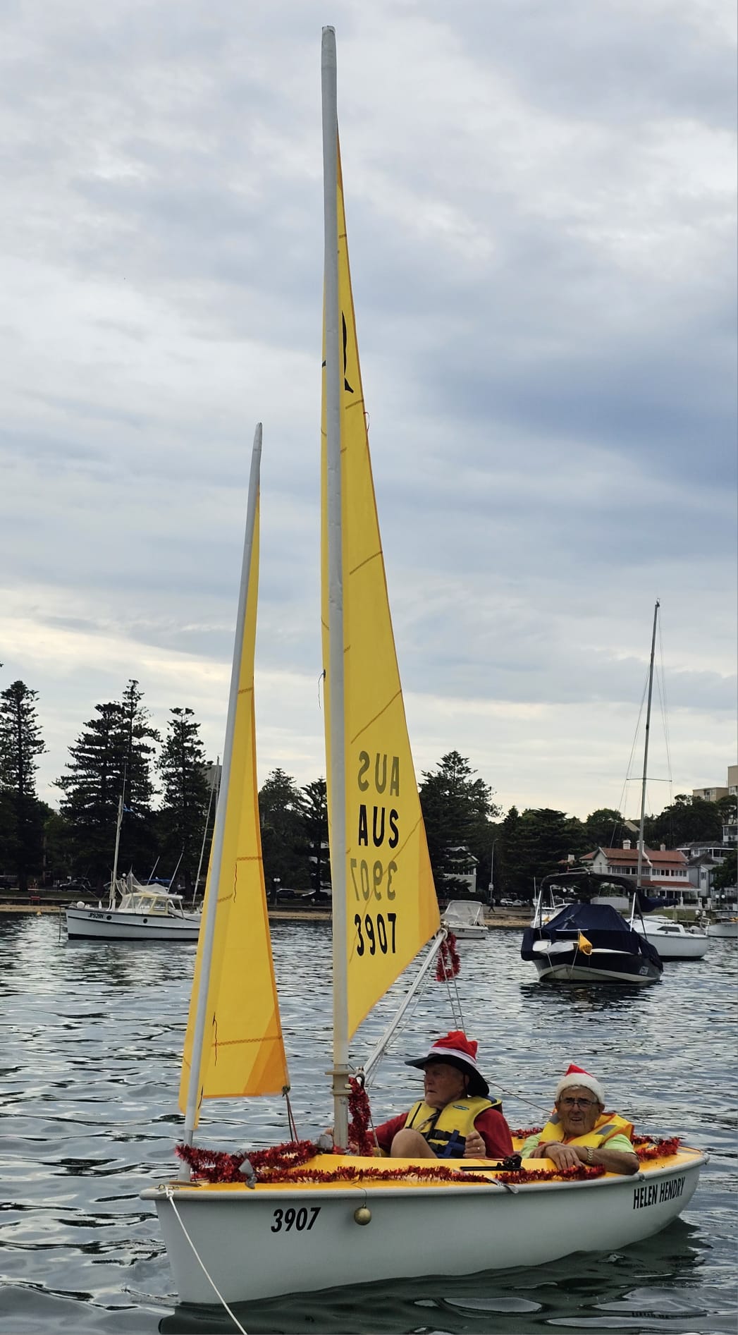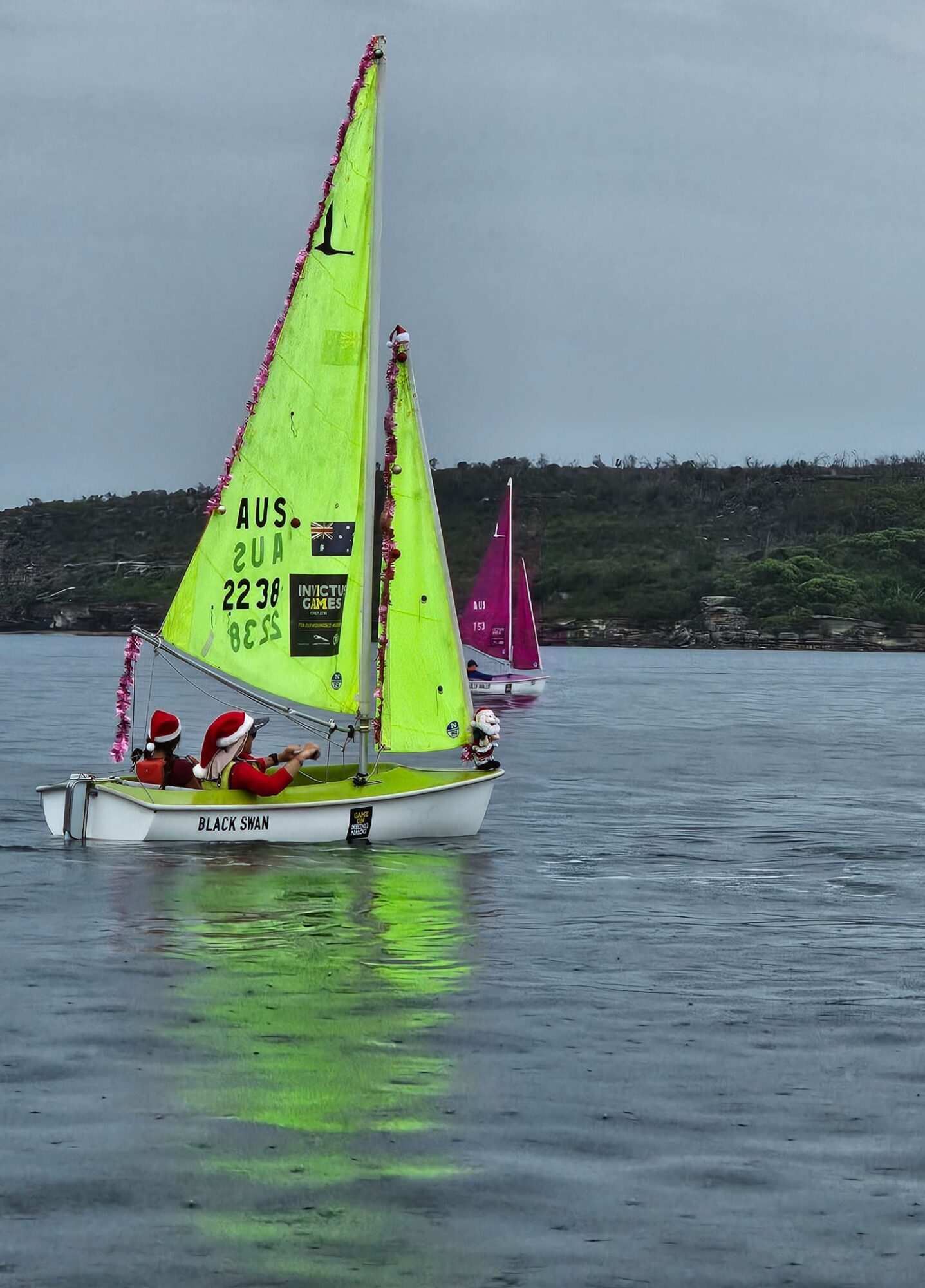 The morning began under cloudy skies with occasional drizzle, and notably, there was no wind. Competitors prepared their boats, embracing the festive spirit by adorning themselves and their vessels with decorations. Vin featured flashing lights on the boom, and a Santa Claus figure, with carols playing from Black Swan led the way, adding to the cheerful atmosphere.